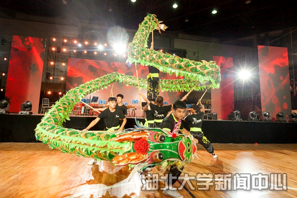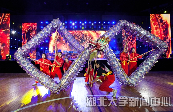 晚上七点,我校龙狮队的舞龙表演《龙腾盛世》拉开晚会帷幕。激昂雄壮的音乐声中,男女队员分别舞动的两条巨龙,时而翻滚飞腾尽显龙马精神,时而围成“85”的造型向母校献礼,赢得现场观众的阵阵掌声。