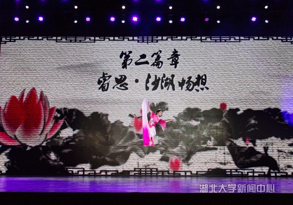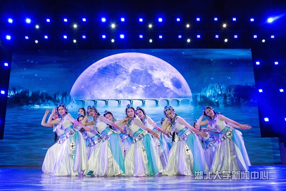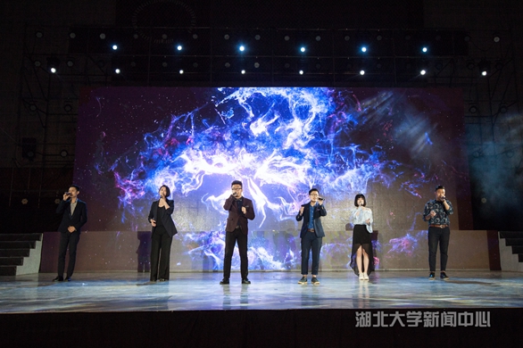 民族乐器演绎的校歌《湖北大学之歌》,悠扬柔美,婉转流畅,给观众不一样的视听体验。大学生艺术团主持人组集体朗诵的《相信,美好的明天》,追忆老一辈湖大人历经坎坷、始终不渝的办学历史,表达新一代湖大人意气风华、昂首向前的豪迈气概。书法舞蹈《水墨琴园》,书法表演者纸上挥毫泼墨,舞蹈演员台上长袖挥舞,宣纸屏幕实时同步,书法舞蹈交相辉映,科技艺术完美结合。靡声清唱团带来的阿卡贝拉表演《海阔天空》和《爱要坦荡荡》,将人声清唱的魅力展现得淋漓尽致。观众纷纷打开手机电筒亮光挥舞互动,现场沉浸在一片星光点点的浪漫氛围中。