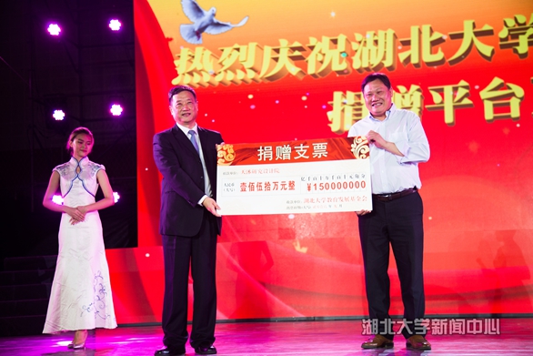 湖北大学85年的办学历程,六易其址,九更校名,不断摸索,砥砺前行。一代又一代湖大儿女终身关注母校,助力母校。母校八十五年校庆之际,湖北大学教育发展基金捐赠平台正式启动,更多的校友和爱心人士为学校教育事业注入生机与活力。校领导、校董、校友代表和社会爱心人士纷纷上场见证平台的启动。校长熊健民、副校长钱建国纷纷使用网上支付形式现场捐款,武汉天沭科技发展有限公司负责人田键教授捐赠150万元。台下师生也通过扫描二维码在线捐赠,支持学校事业发展。