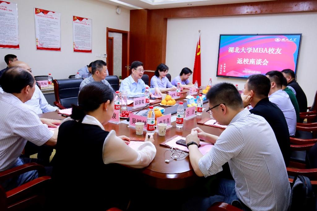 4月19日,湖北大学MBA校友会会长骆黎明一行回访母校。校友总会常务副会长、教育发展基金会理事长钱建国,学校合作发展处、商学院等单位负责人及导师代表与返校校友座谈交流。